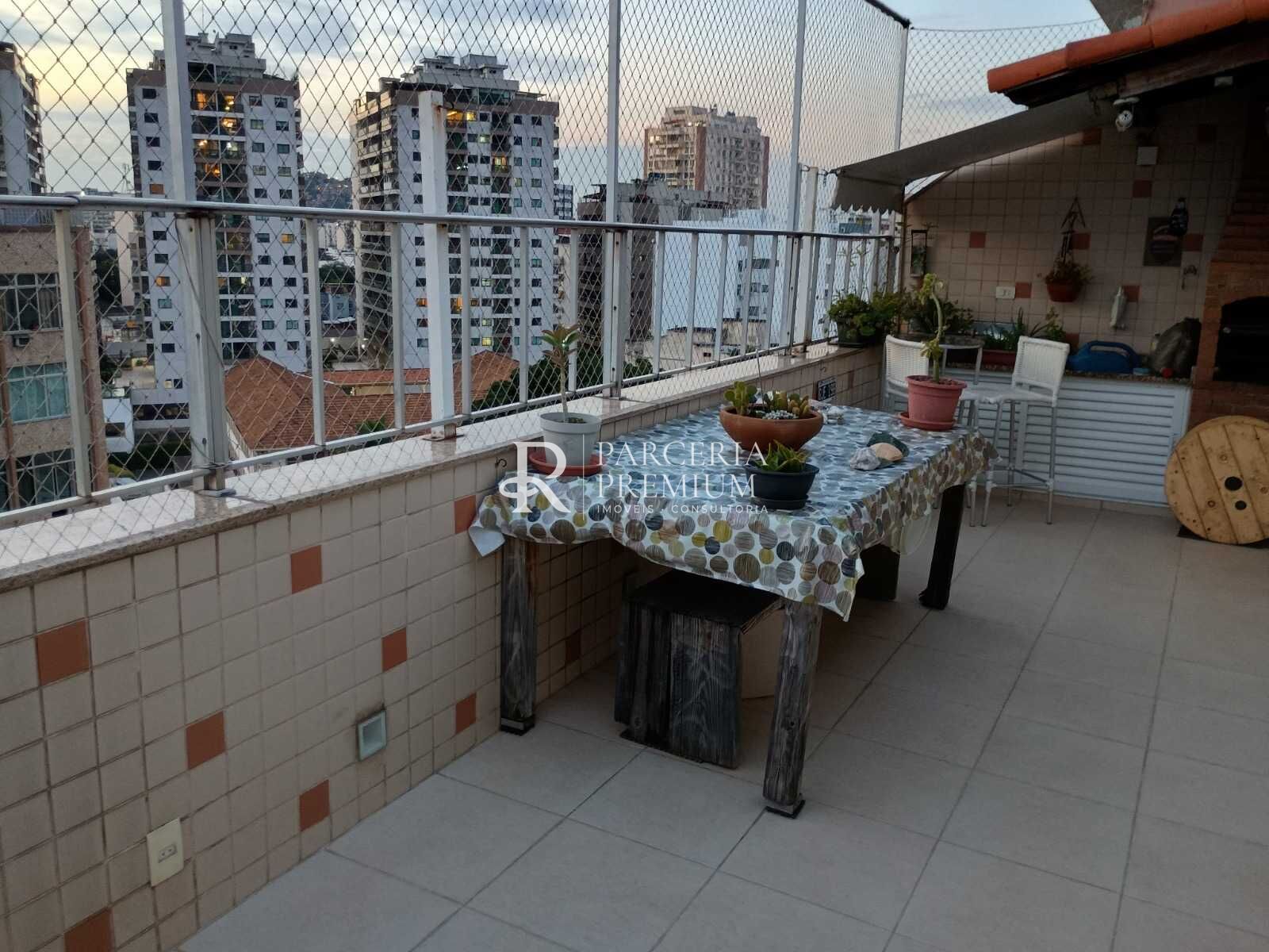 Tijuca. Cobertura linear, 3 quartos (1 suíte), 169 m², com churrasqueira e espaço para instalação de piscina. Imóvel reformado, com piso em porcelanato, paredes em cores claras, em estado de novo. 2 vagas de garagem cobertas. Prédio sem lazer, a 5 minutos da Praça Saenz Pena.